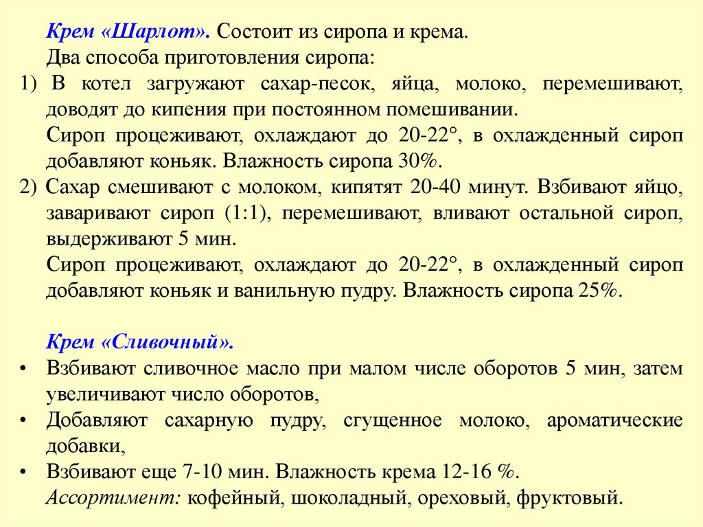 Крем «Шарлот». Состоит из сиропа и крема.Два способа приготовления сиропа: