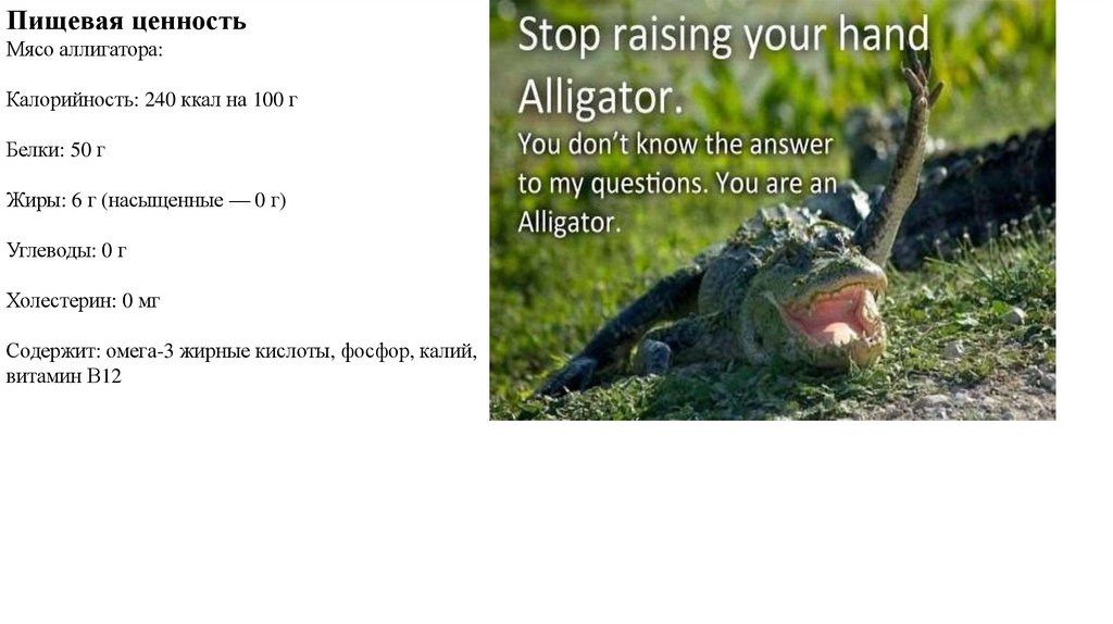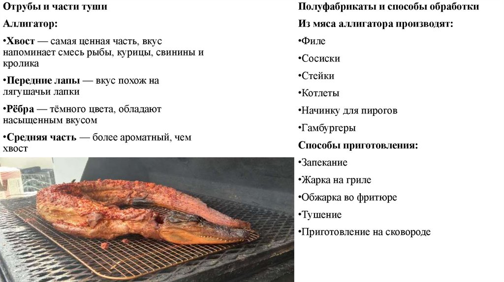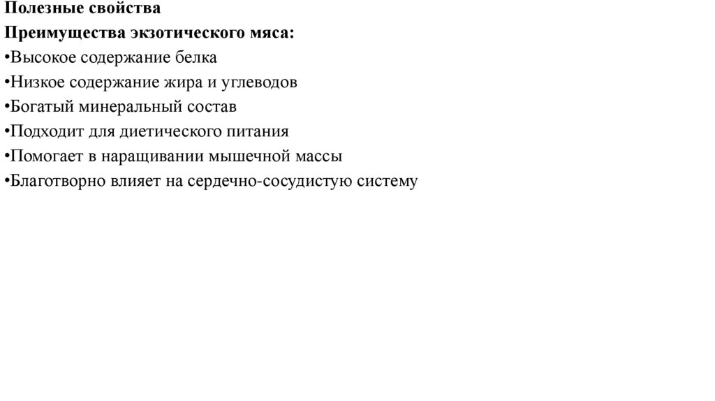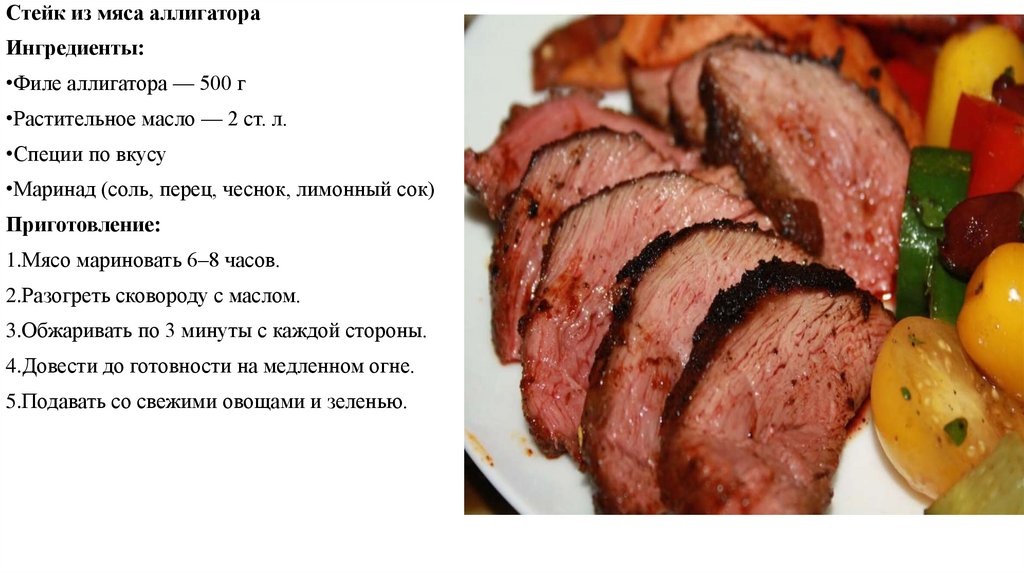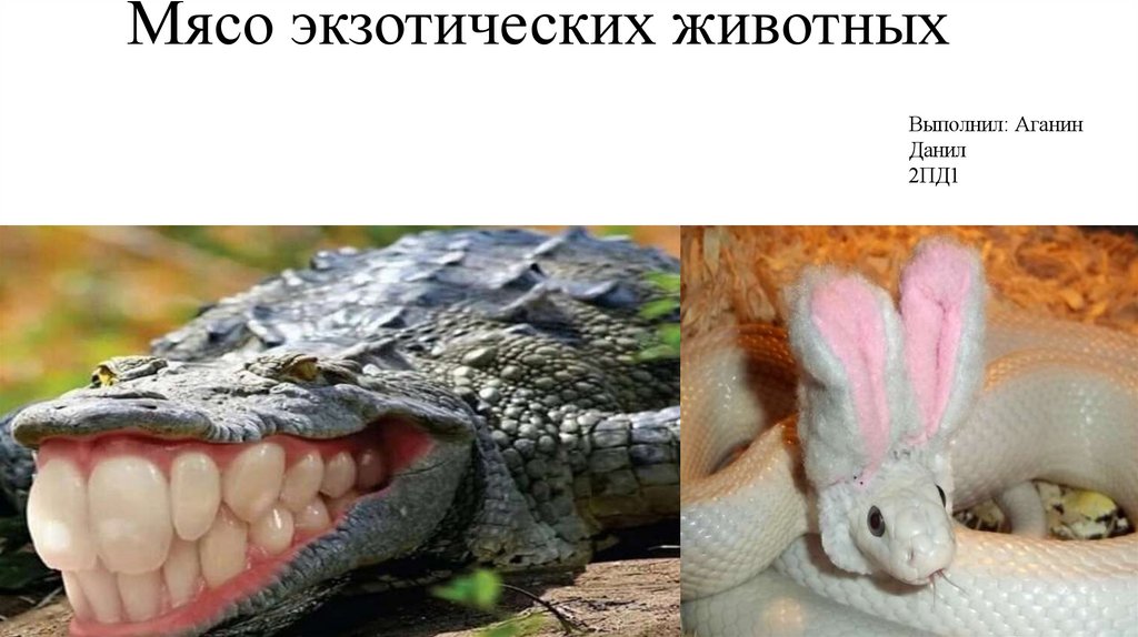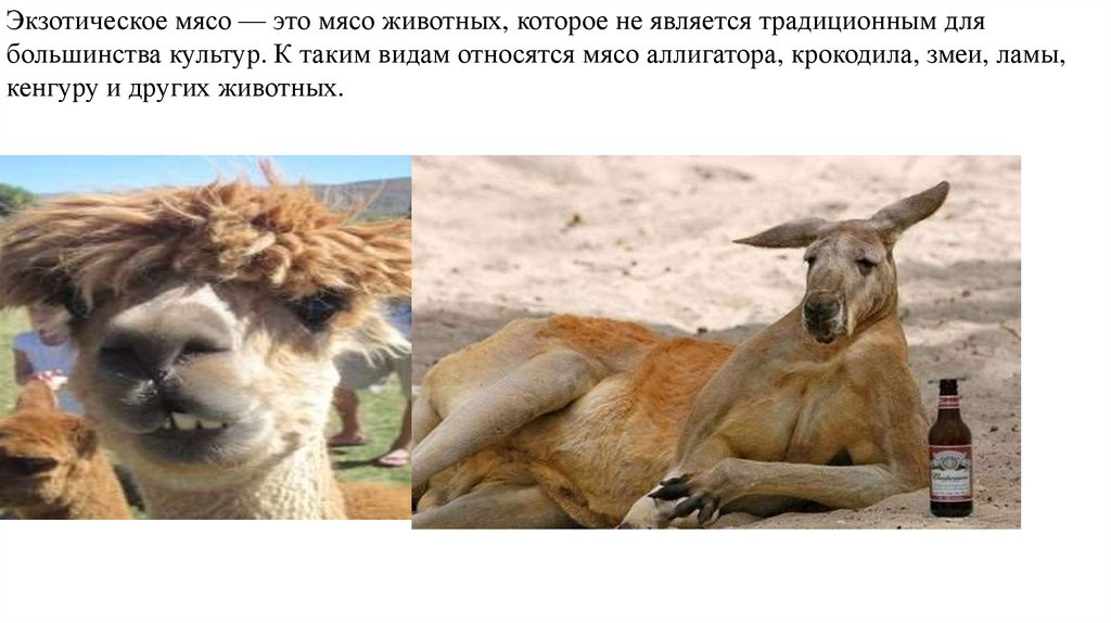Экзотическое мясо — это мясо животных, которое не является традиционным длябольшинства культур. К таким видам относятся мясо аллигатора, крокодила, змеи, ламы,