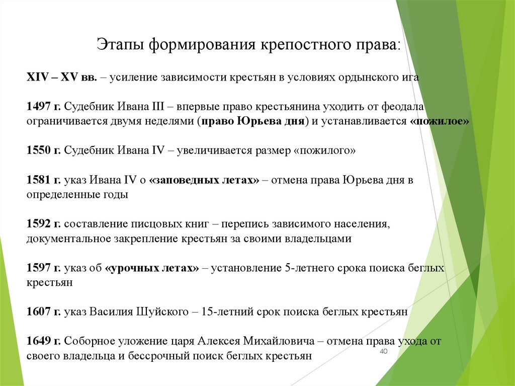 Этапы формирования крепостного права:XIV – XV вв. – усиление зависимости крестьян в условиях ордынского ига