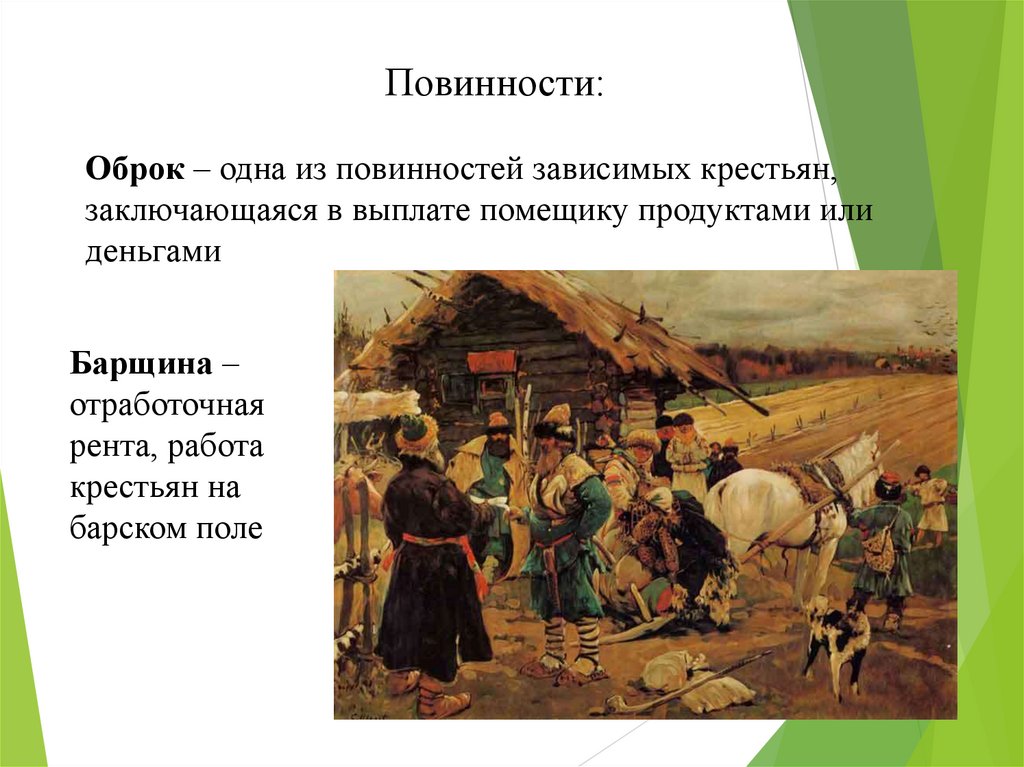Повинности:Оброк – одна из повинностей зависимых крестьян,