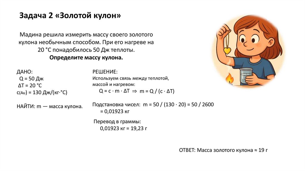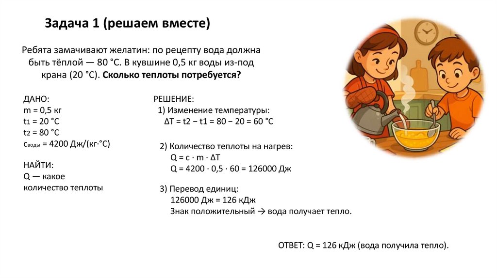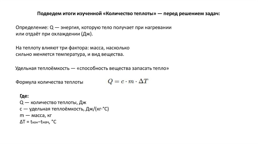 Q — количество теплоты (в джоулях, Дж). Это энергия, которую тело получило или отдало.