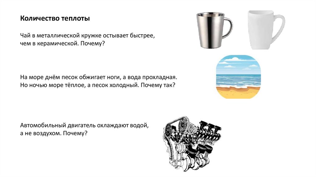 Количество теплотыЧай в металлической кружке остывает быстрее,