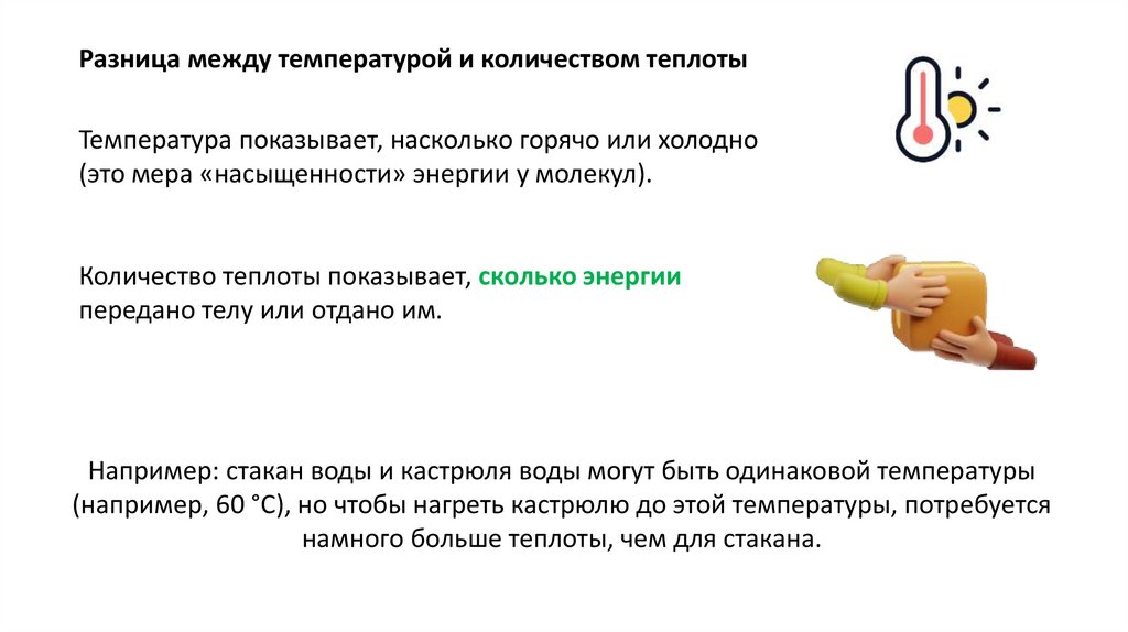 Разница между температурой и количеством теплотыТемпература показывает, насколько горячо или холодно