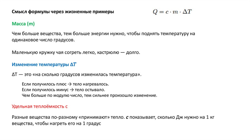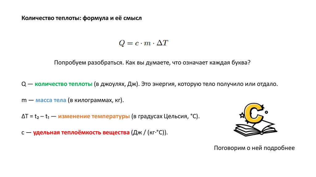 Количество теплоты: формула и её смыслПопробуем разобраться. Как вы думаете, что означает каждая буква?