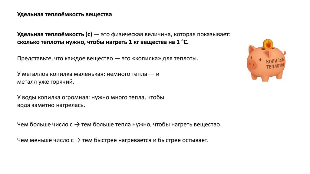 Представьте, что каждое вещество — это «копилка» для теплоты.