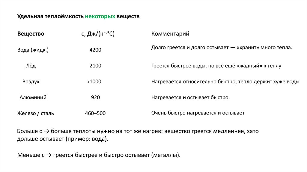 Меньше c → греется быстрее и быстро остывает (металлы).