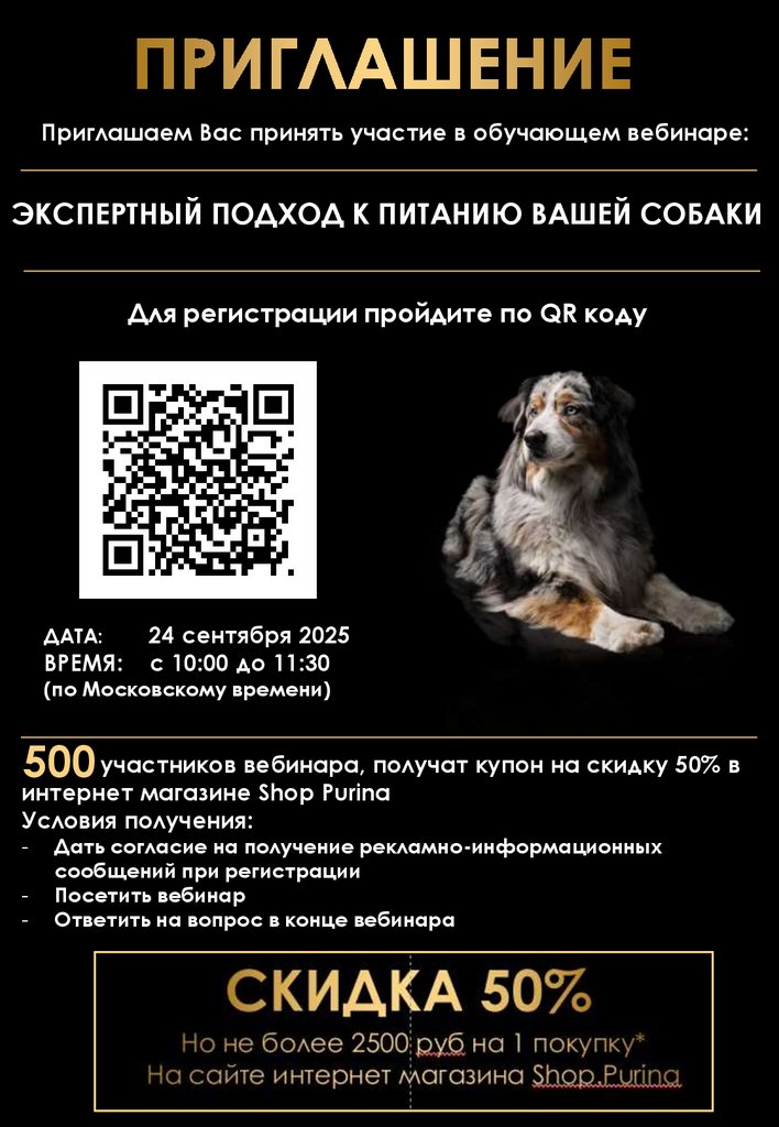 Приглашаем Вас принять участие в обучающем вебинаре:ЭКСПЕРТНЫЙ ПОДХОД К ПИТАНИЮ ВАШЕЙ СОБАКИ