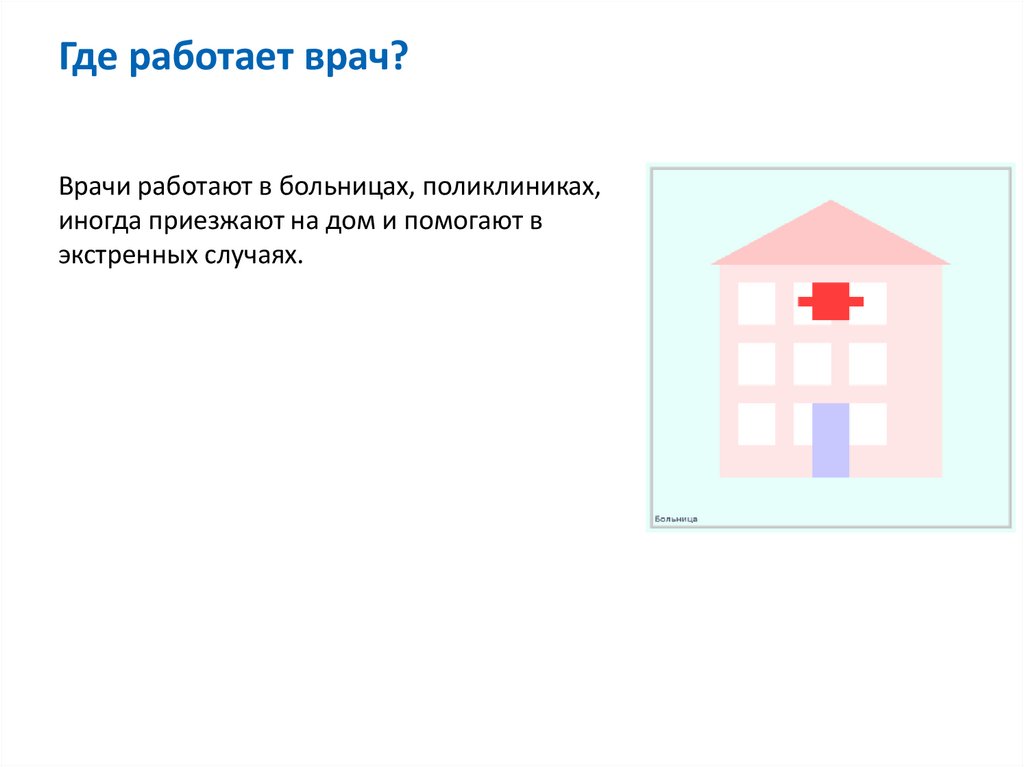 Где работает врач?Врачи работают в больницах, поликлиниках,