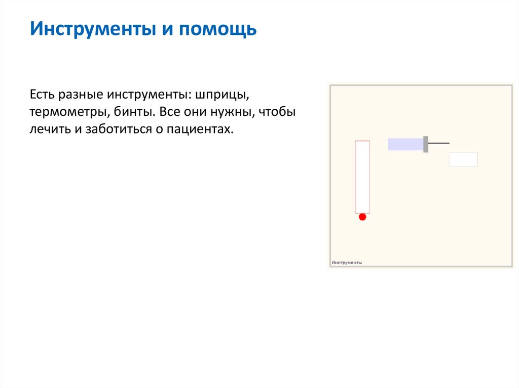 Инструменты и помощьЕсть разные инструменты: шприцы,