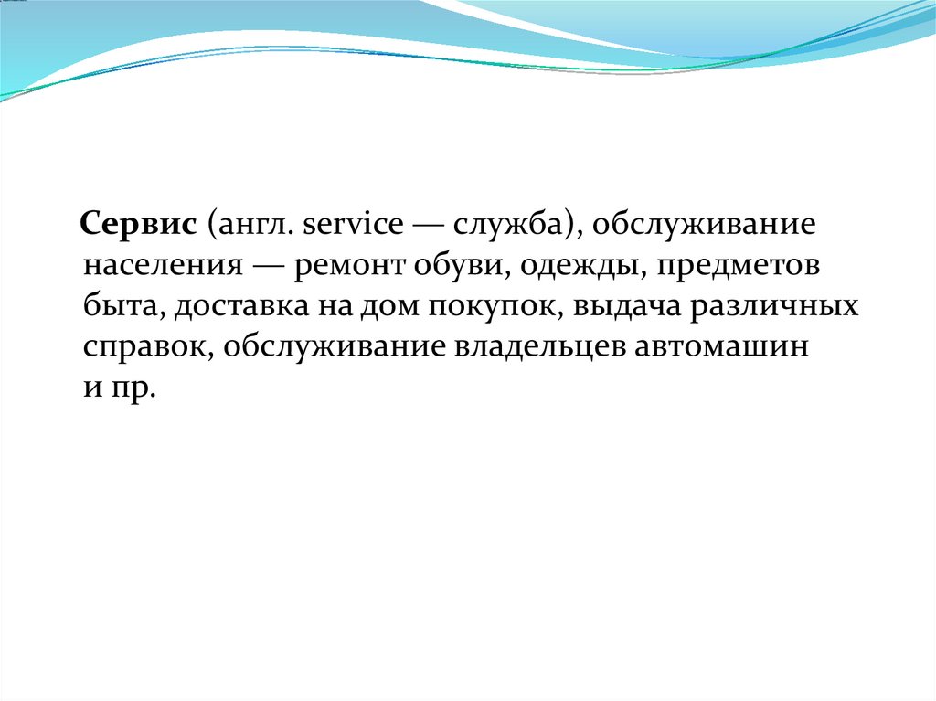 Сервис (англ. service — служба), обслуживаниенаселения — ремонт обуви, одежды, предметов