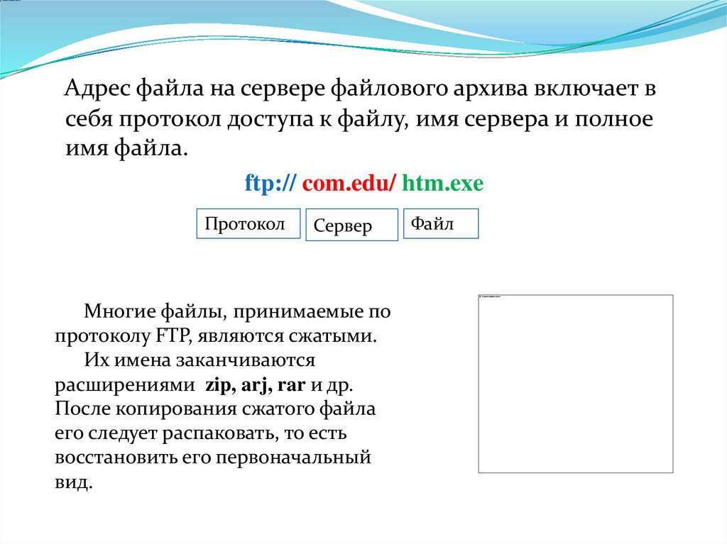 Адрес файла на сервере файлового архива включает всебя протокол доступа к файлу, имя сервера и полное