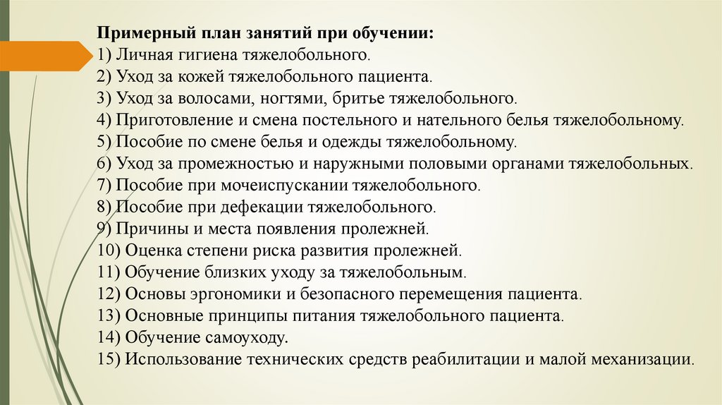 Примерный план занятий при обучении:1) Личная гигиена тяжелобольного.