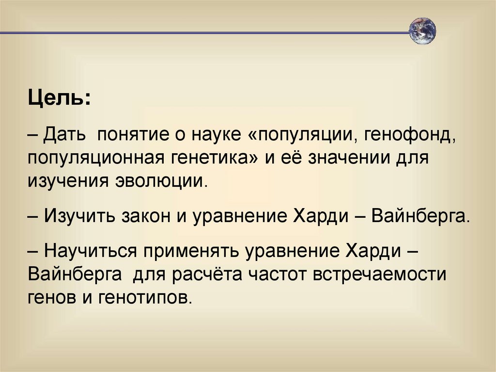 Цель:– Дать понятие о науке «популяции, генофонд,