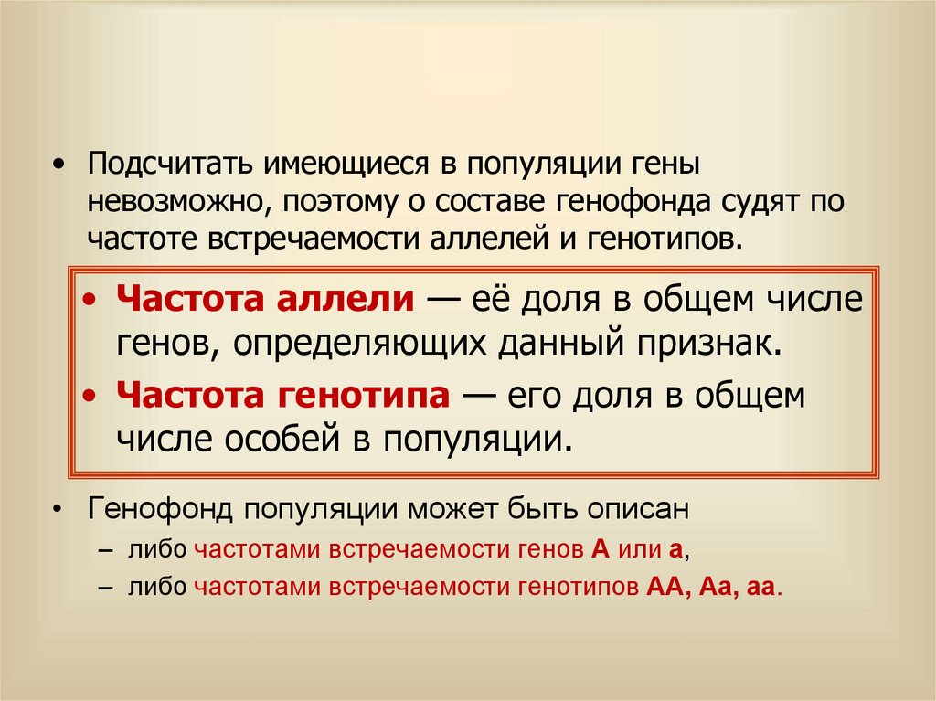 ГЕНОФОНД – сумма всех генотипов, представленных в популяции.Закономерности изменения генофонда популяции отражают общие тенденции, которые могут