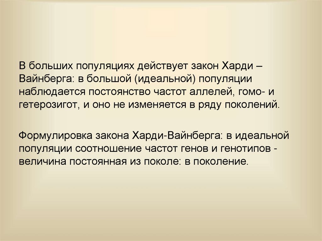 В больших популяциях действует закон Харди –Вайнберга: в большой (идеальной) популяции