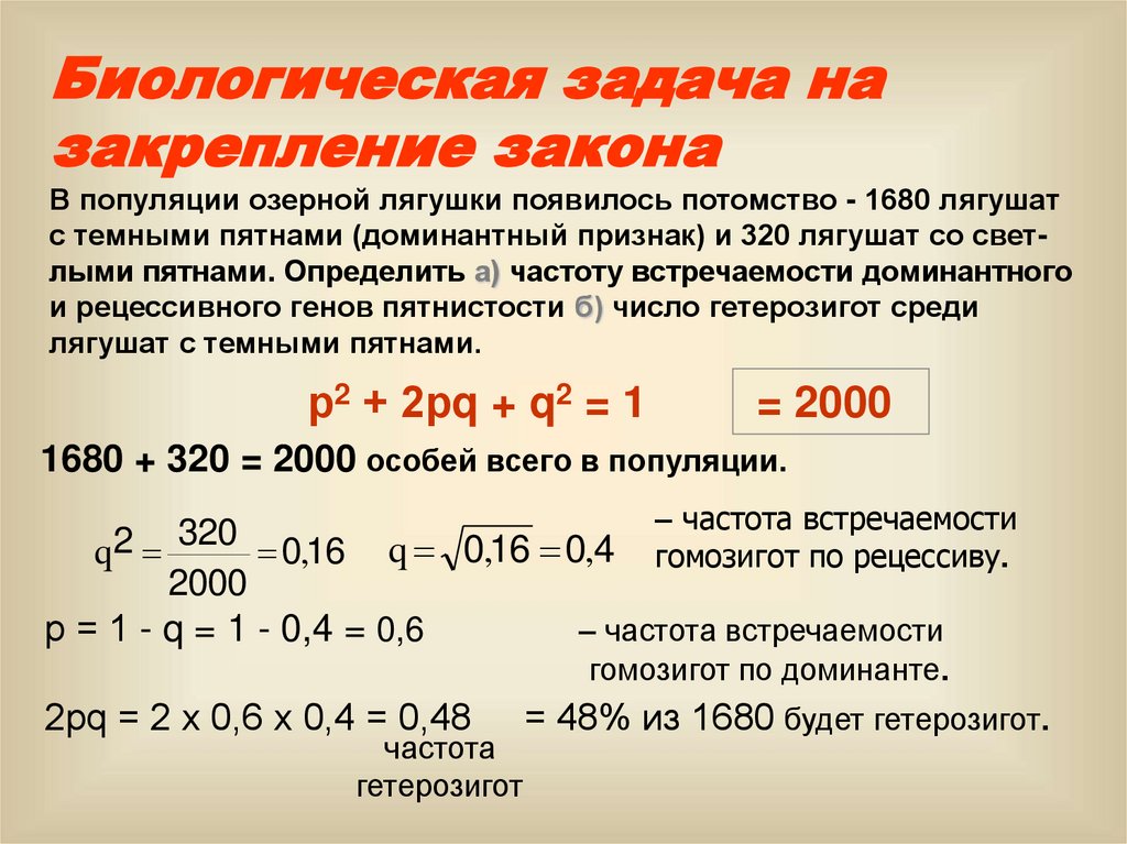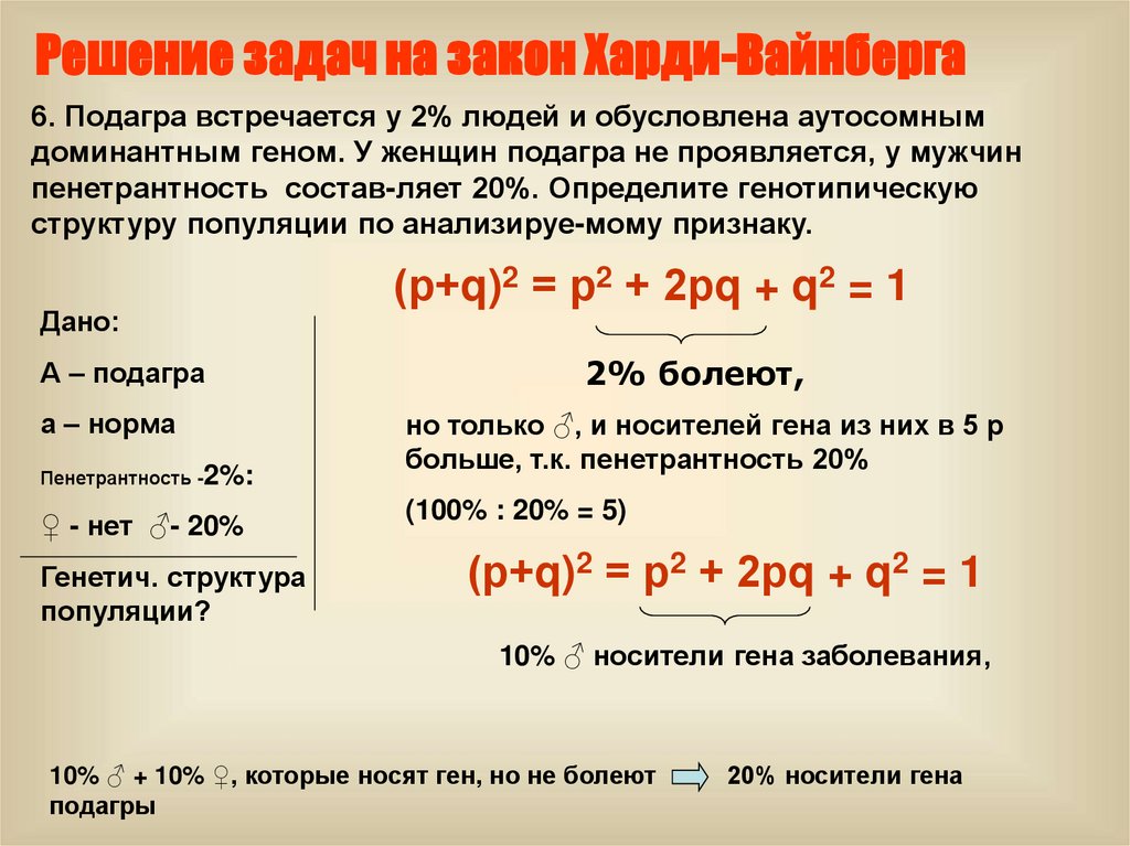 Решение задач на закон Харди-Вайнберга6. Подагра встречается у 2% людей и обусловлена аутосомным