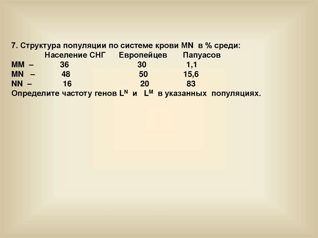 7. Структура популяции по системе крови МN в % среди:Население СНГ