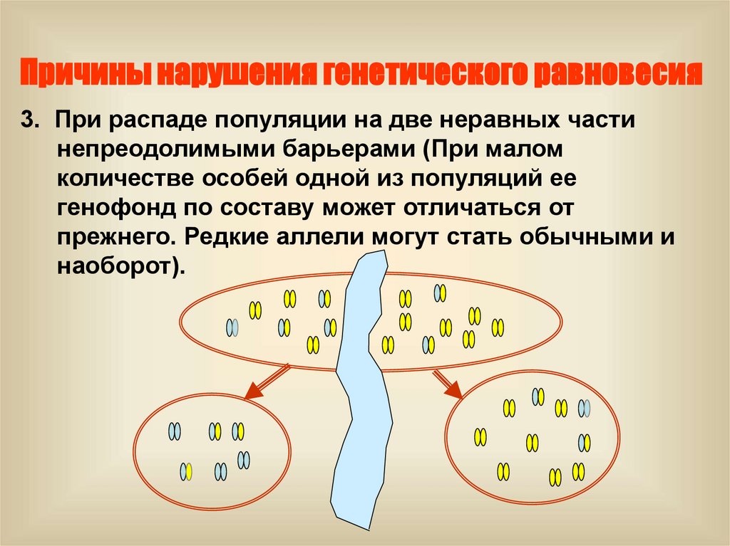 Причины нарушения генетического равновесия3. При распаде популяции на две неравных части
