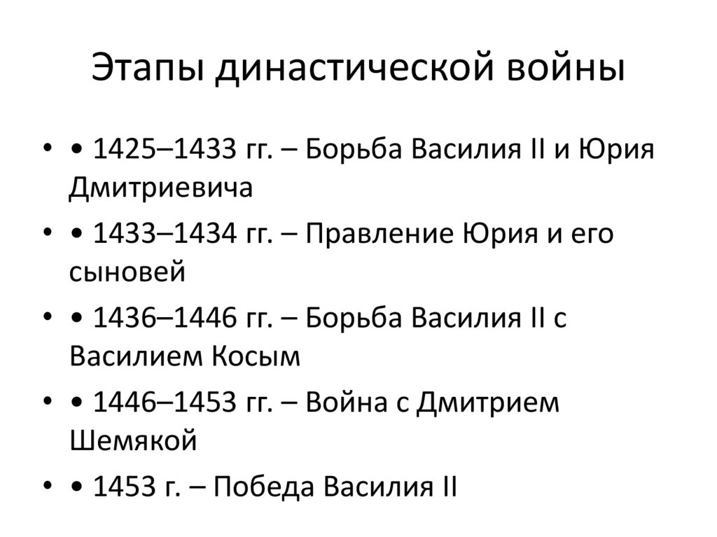 Этапы династической войны• • 1425–1433 гг. – Борьба Василия II и Юрия