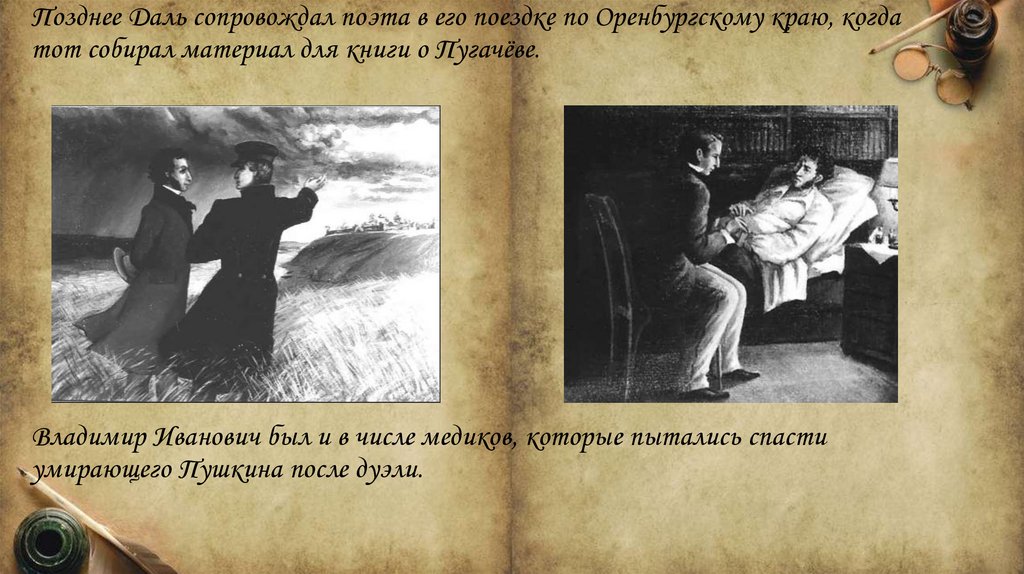 Позднее Даль сопровождал поэта в его поездке по Оренбургскому краю, когдатот собирал материал для книги о Пугачёве.