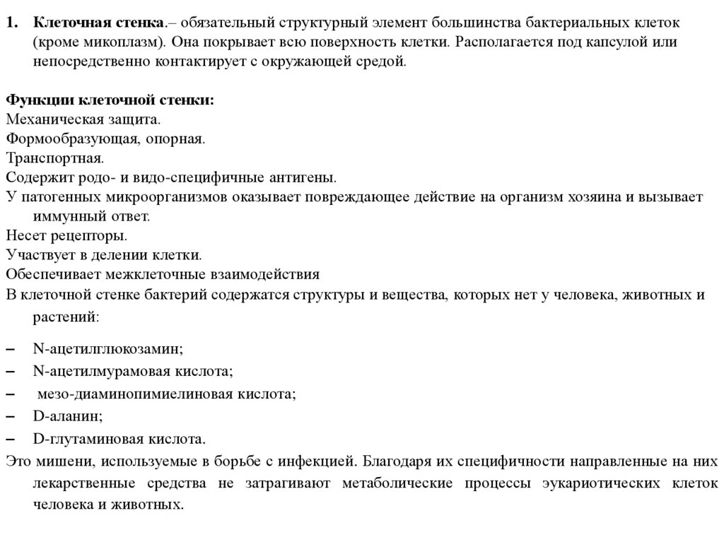 1. Клеточная стенка.– обязательный структурный элемент большинства бактериальных клеток(кроме микоплазм). Она покрывает всю поверхность клетки. Располагается под капсулой или