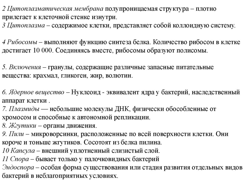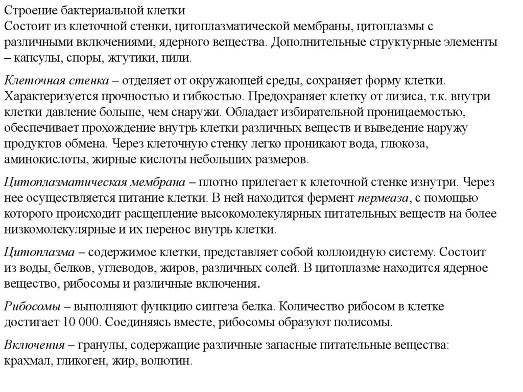 Строение бактериальной клеткиСостоит из клеточной стенки, цитоплазматической мембраны, цитоплазмы с