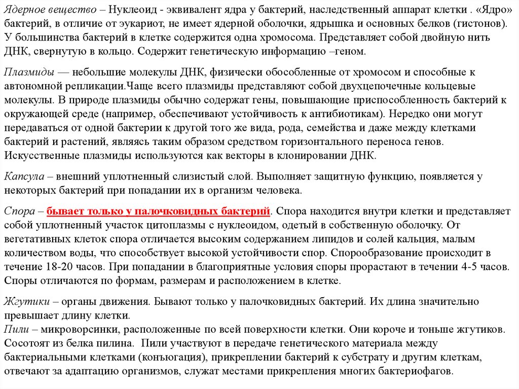 Спора – бывает только у палочковидных бактерий. Спора находится внутри клетки и представляет