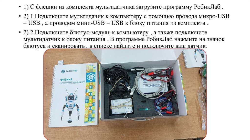 • 1) С флешки из комплекта мультидатчика загрузите программу РобикЛаб .• 2) 1.Подключите мультидачик к компьютеру с помощью провода микро-USB