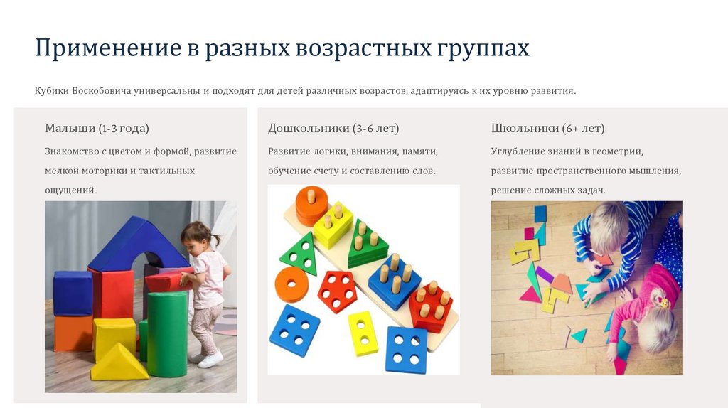 Применение в разных возрастных группахКубики Воскобовича универсальны и подходят для детей различных возрастов, адаптируясь к их уровню развития.