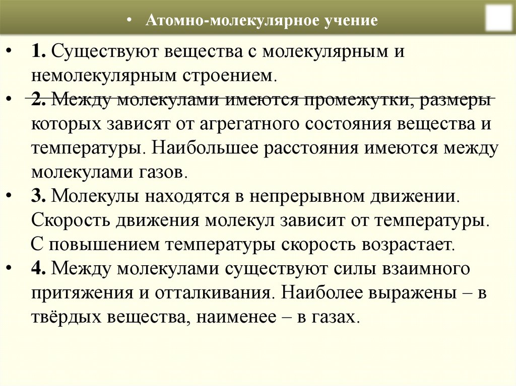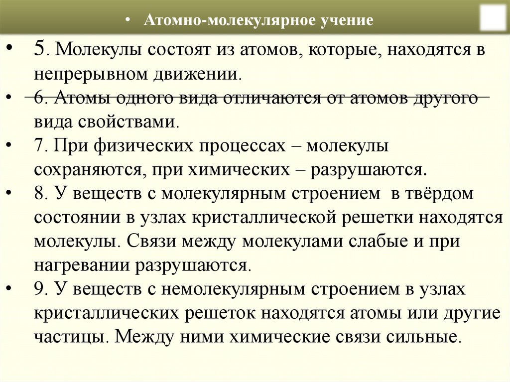 • Атомно-молекулярное учение• 5. Молекулы состоят из атомов, которые, находятся в