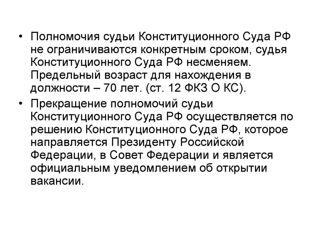 ФКЗ о КС и федеральным законом о статусе судей (ст. 15 ФКЗ о КС).