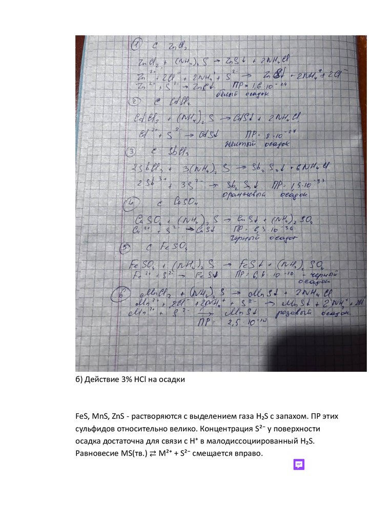 б) Действие 3% HCl на осадкиFeS, MnS, ZnS - растворяются с выделением газа H₂S с запахом. ПР этих