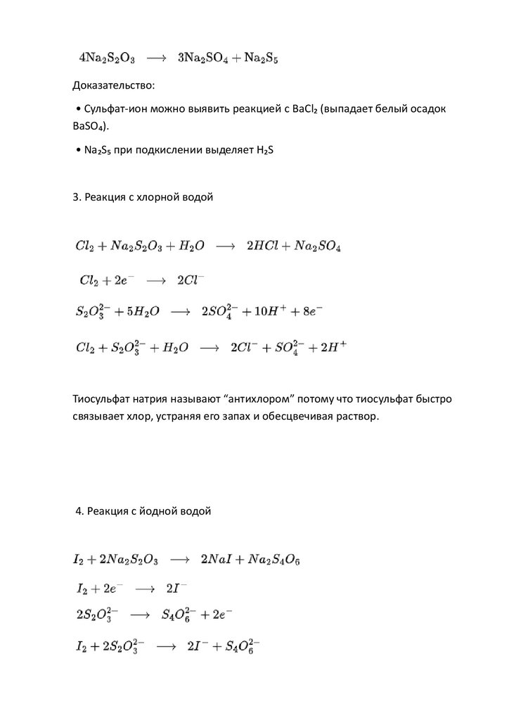 · "Антихлор": 2Na₂S₂O₃ + I₂ → 2NaI + Na₂S₄O₆ (применяется в йодометрии).