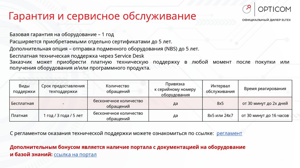 Гарантия и сервисное обслуживаниеБазовая гарантия на оборудование – 1 год