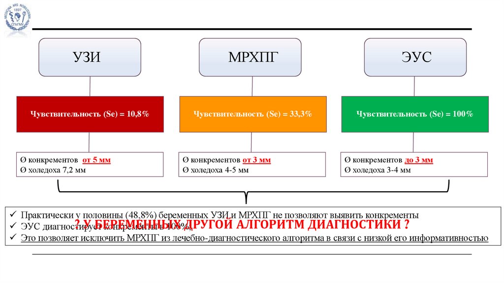 • При подозрении на осложненное течение ЖКБ у беременной необходимо исключить из