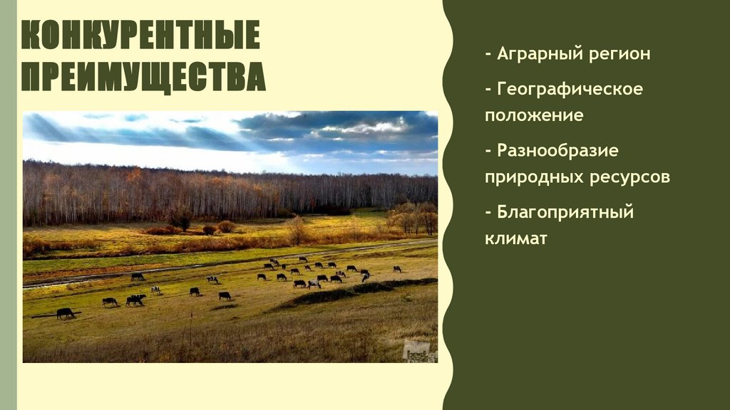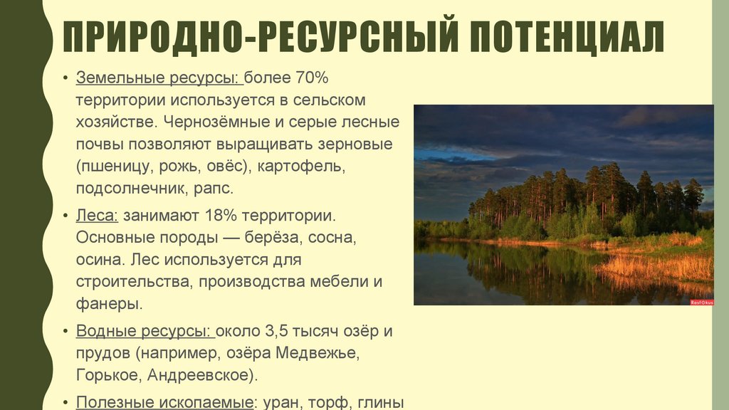 ПРИРОДНО-РЕСУРСНЫЙ ПОТЕНЦИАЛ• Земельные ресурсы: более 70%
