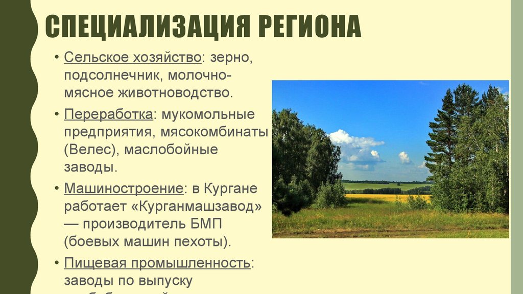 СПЕЦИАЛИЗАЦИЯ РЕГИОНА• Сельское хозяйство: зерно,