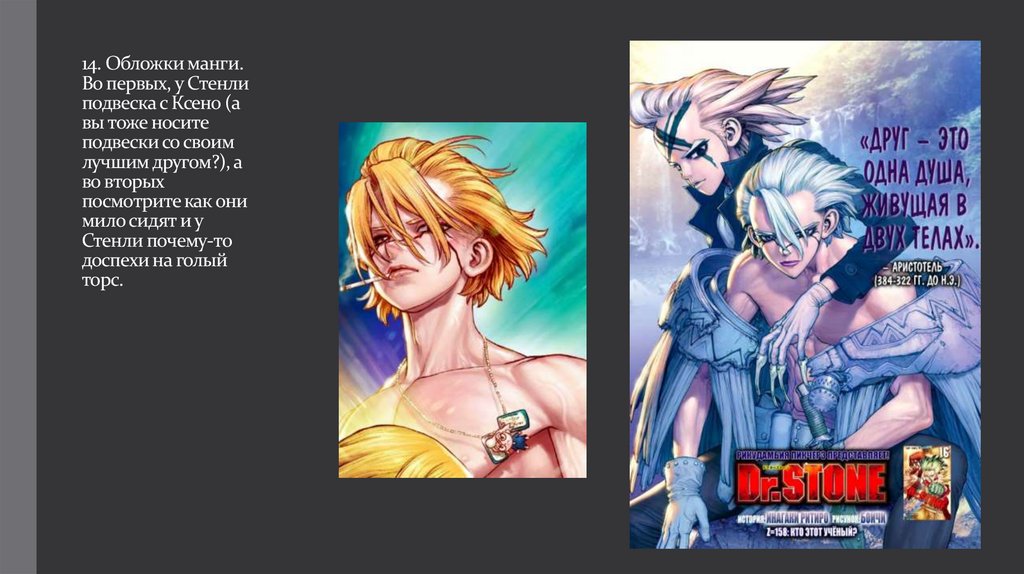 22. 16. Парная одежда? Представлены арты мерча и на первом мерче Ксено в кожанке, а Стенли в пиджаке, ну а на втором наоборот.