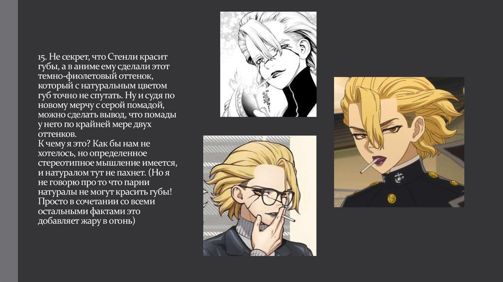 15. Не секрет, что Стенли краситгубы, а в аниме ему сделали этот