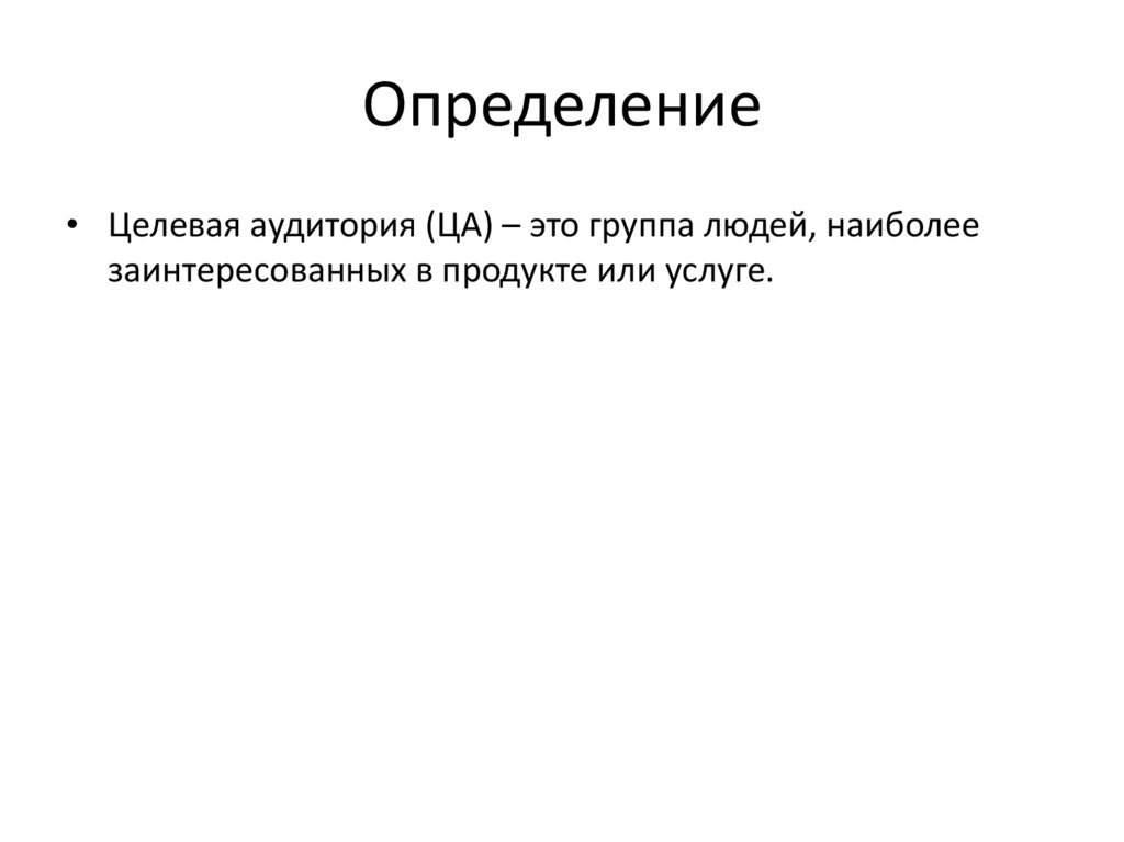 Определение• Целевая аудитория (ЦА) – это группа людей, наиболее