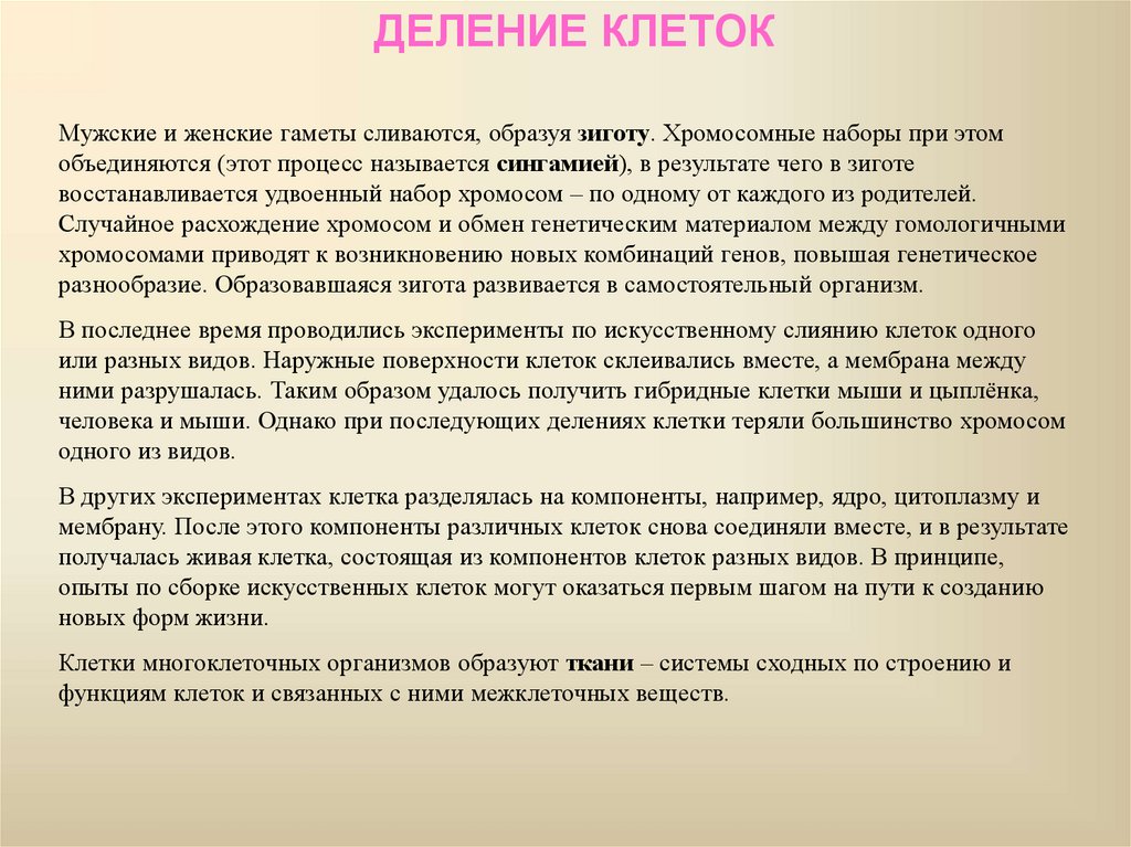 начинается с одной клетки - зиготы; клетка – основа физиологических и биохимических процессов в организме,