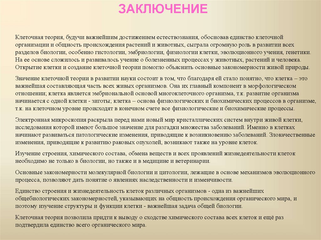 ЗАКЛЮЧЕНИЕКлеточная теория, будучи важнейшим достижением естествознания, обосновав единство клеточной