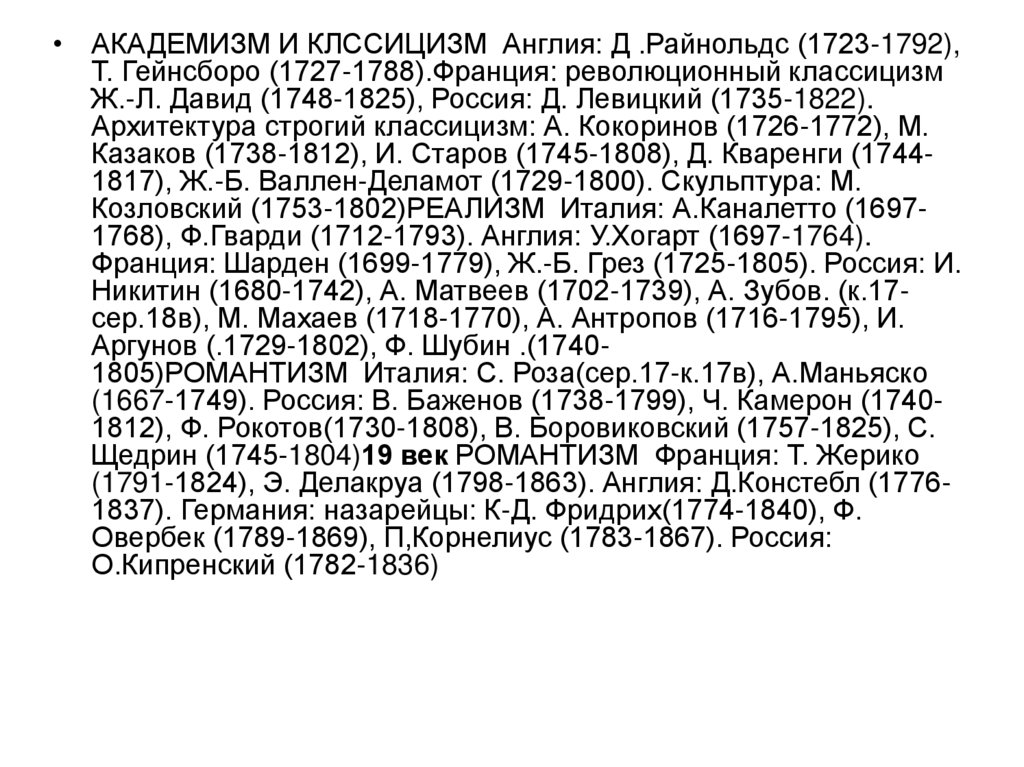 (1667-1749). Россия: В. Баженов (1738-1799), Ч. Камерон (17401812), Ф. Рокотов(1730-1808), В. Боровиковский (1757-1825), С.