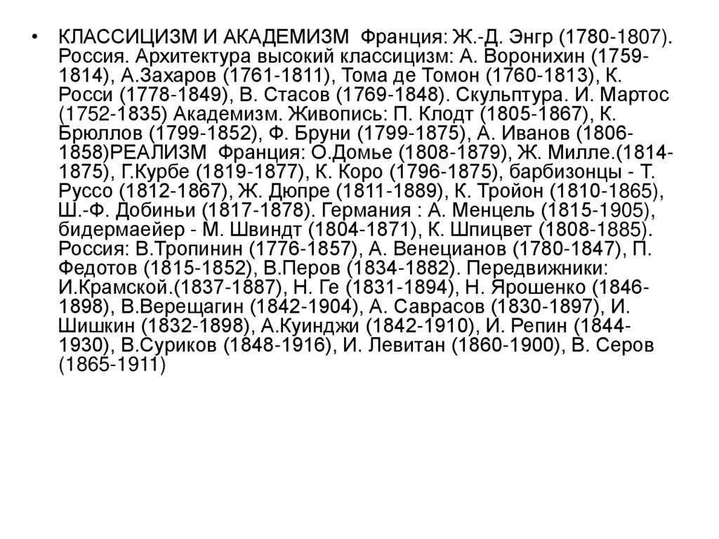 • КЛАССИЦИЗМ И АКАДЕМИЗМ Франция: Ж.-Д. Энгр (1780-1807).Россия. Архитектура высокий классицизм: А. Воронихин (17591814), А.Захаров (1761-1811), Тома де Томон (1760-1813), К.