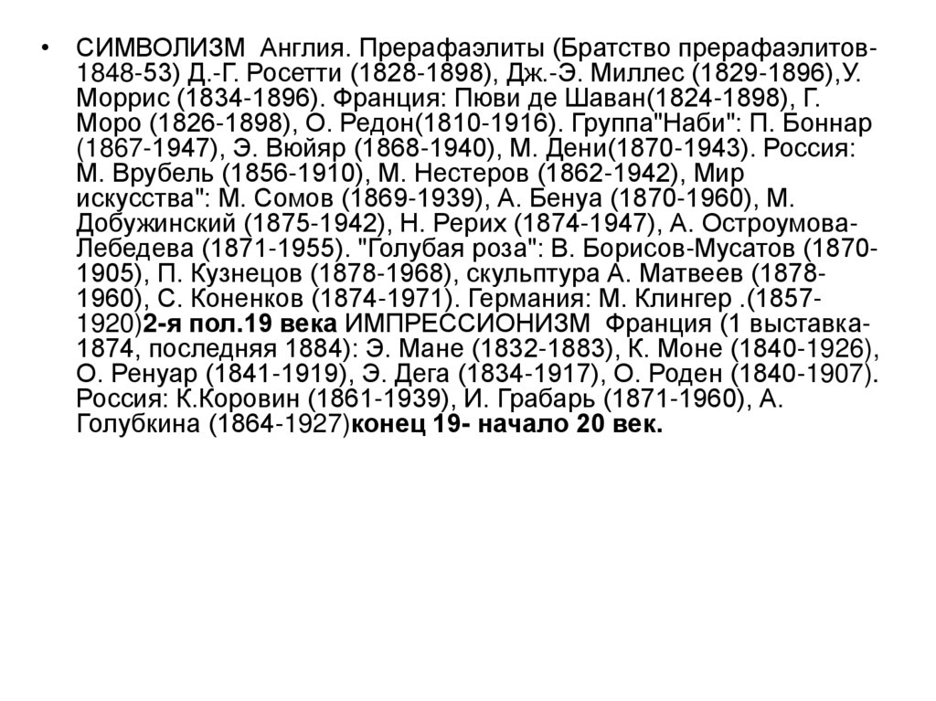 • СИМВОЛИЗМ Англия. Прерафаэлиты (Братство прерафаэлитов1848-53) Д.-Г. Росетти (1828-1898), Дж.-Э. Миллес (1829-1896),У.Моррис (1834-1896). Франция: Пюви де Шаван(1824-1898), Г.