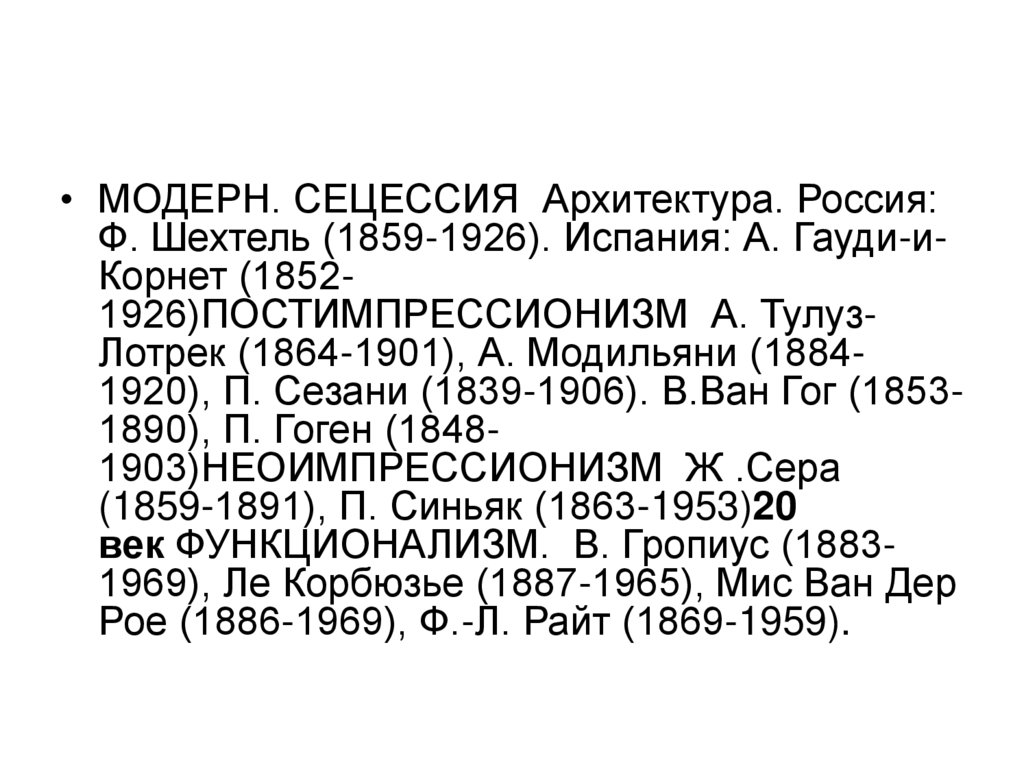 • МОДЕРН. СЕЦЕССИЯ Архитектура. Россия:Ф. Шехтель (1859-1926). Испания: А. Гауди-иКорнет (18521926)ПОСТИМПРЕССИОНИЗМ А. ТулузЛотрек (1864-1901), А. Модильяни (18841920), П. Сезани (1839-1906). В.Ван Гог (18531890), П. Гоген (18481903)НЕОИМПРЕССИОНИЗМ Ж .Сера
