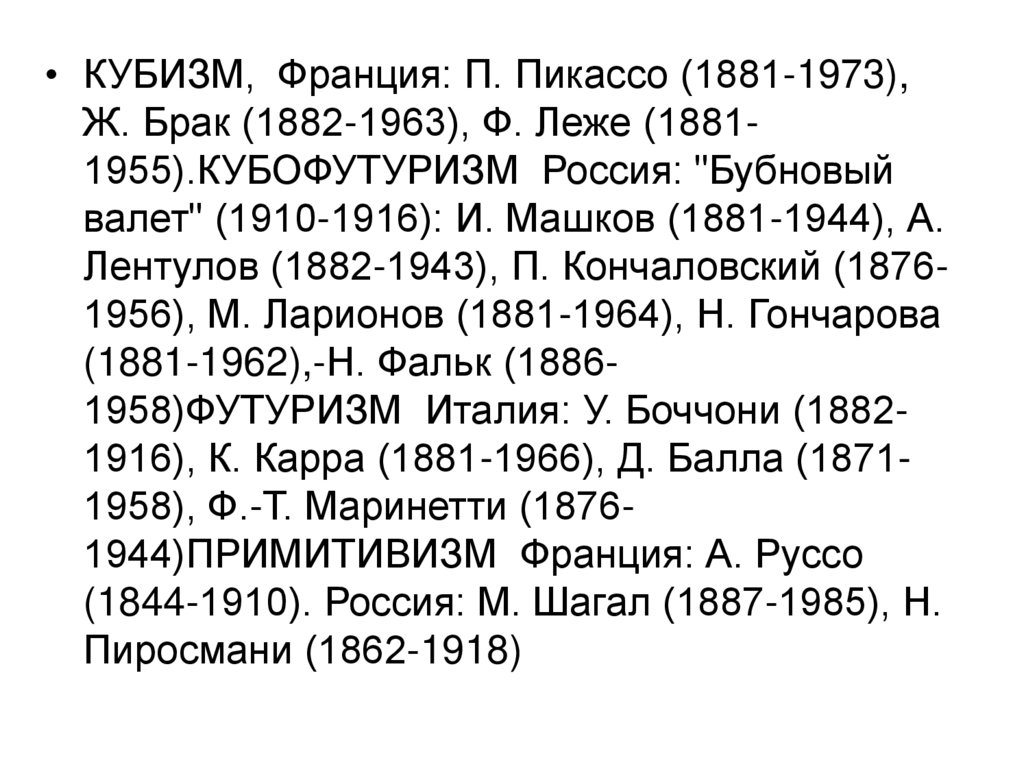 • КУБИЗМ, Франция: П. Пикассо (1881-1973),Ж. Брак (1882-1963), Ф. Леже (18811955).КУБОФУТУРИЗМ Россия: "Бубновый