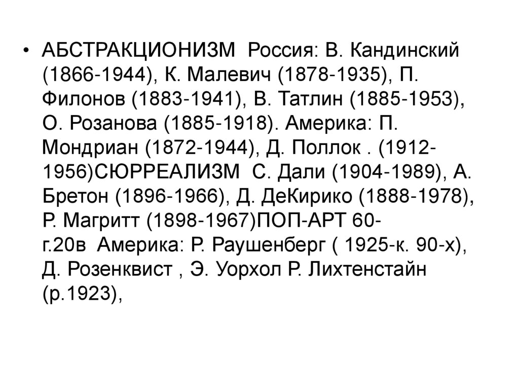 • АБСТРАКЦИОНИЗМ Россия: В. Кандинский(1866-1944), К. Малевич (1878-1935), П.