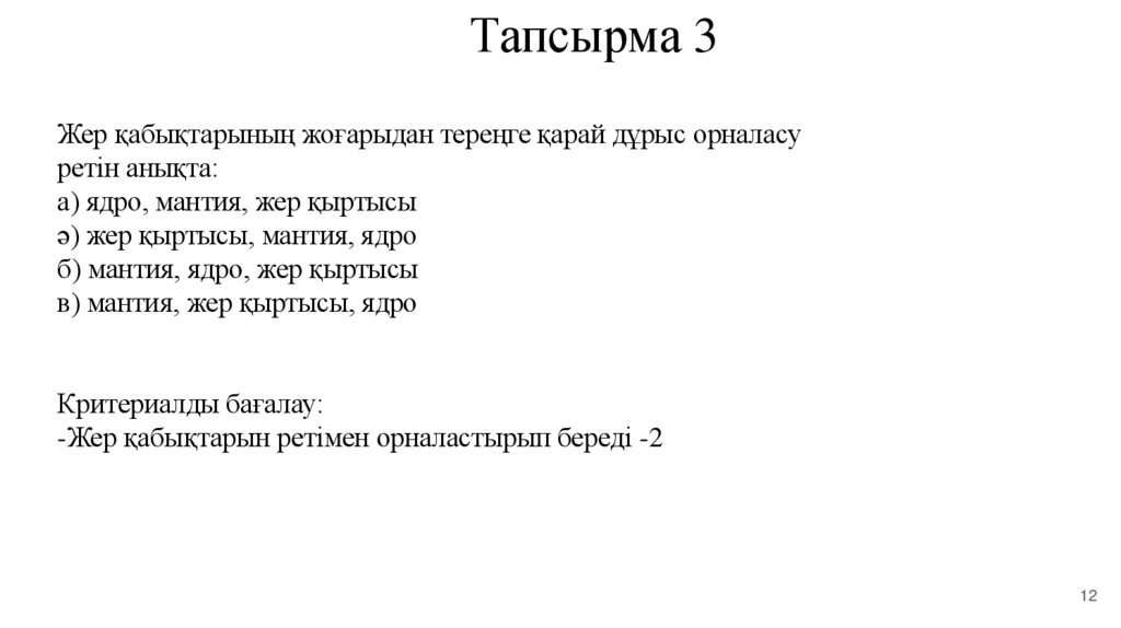 Тапсырма 3Жер қабықтарының жоғарыдан тереңге қарай дұрыс орналасу
