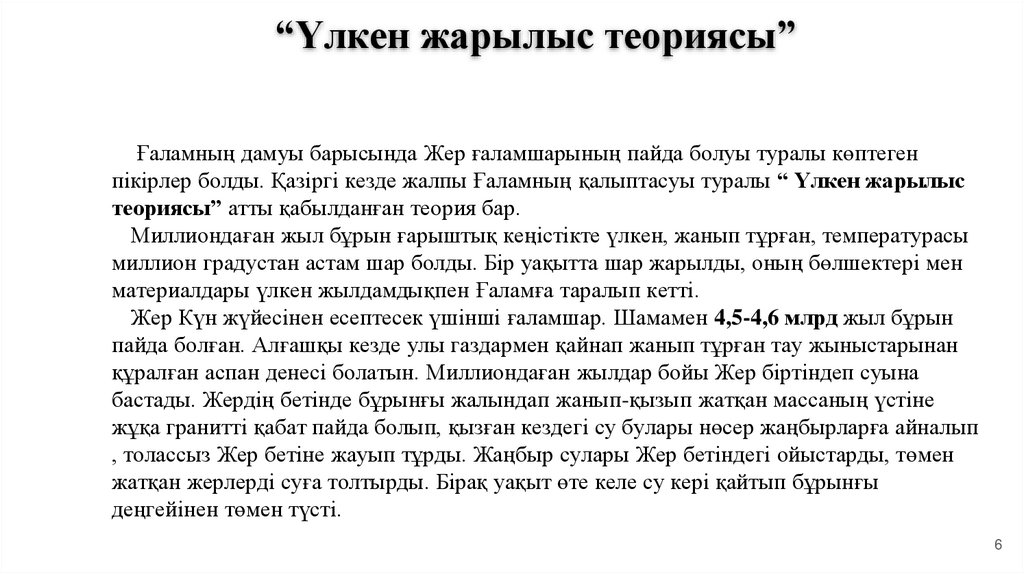 “Үлкен жарылыс теориясы”Ғаламның дамуы барысында Жер ғаламшарының пайда болуы туралы көптеген